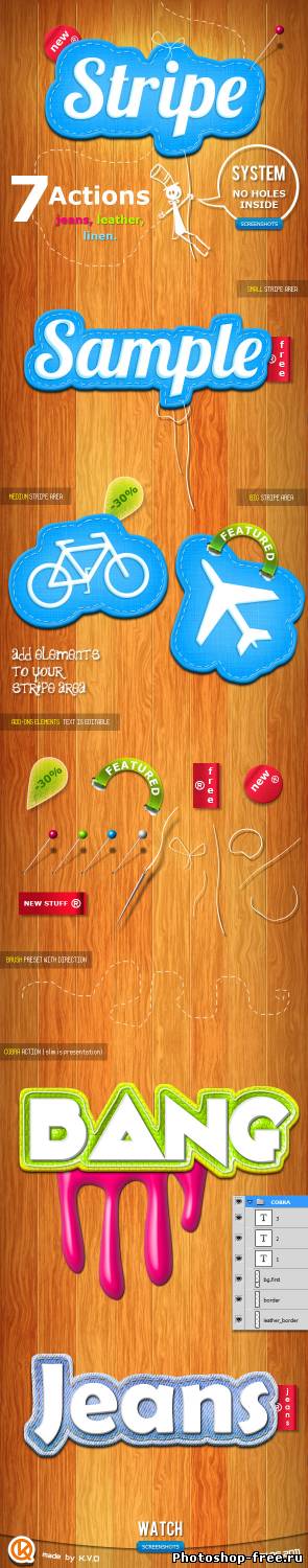 ![]() Elements PSD содержит элементы для декорирования текста. Каждый элемент многослойный. - Иголки,булавки - Нитки - Лейблы, этикетки - Клякса Stripe_actions ATN содержит 7 операций. - Blue texture small - Blue texture medium - Blue texture large - Jeans texture small - Jeans texture medium - Jeans texture large - Cobra texture * Создаете документ, пишете текст или вставьте форму , выберите нужную операцию и нажимаете PLAY. Stripe styles ASL содержит 21 стиль для текста Stripe brushes ABR содержит 2 кисти для эффектов на тексте Залейте содержимое папки files_to_load в фотошоп и можете приступать к работе =) | |