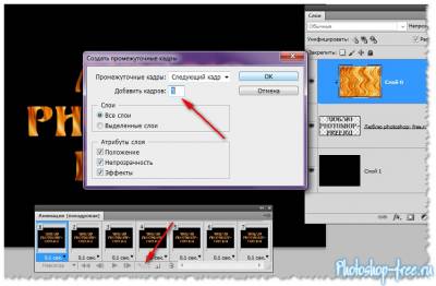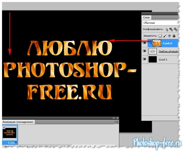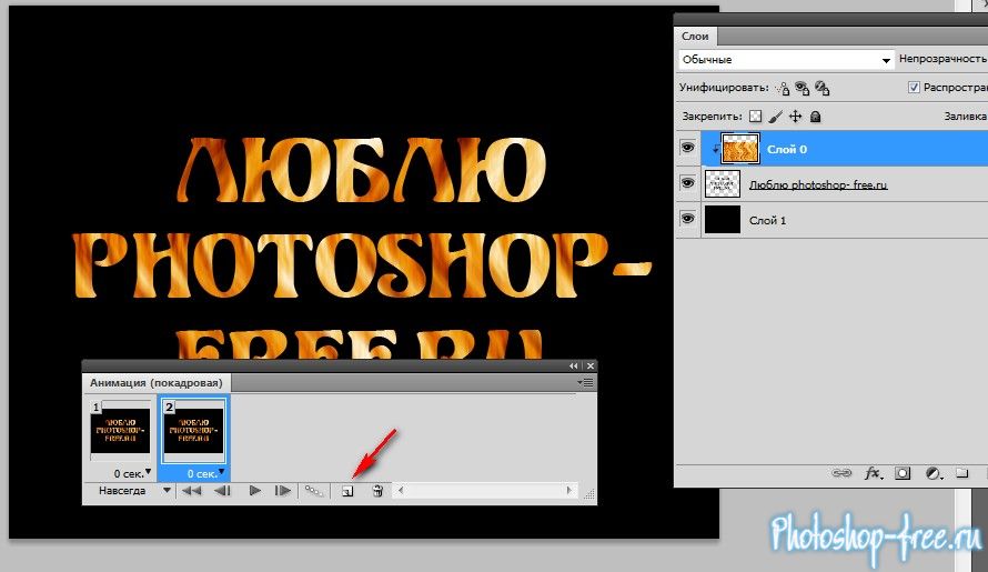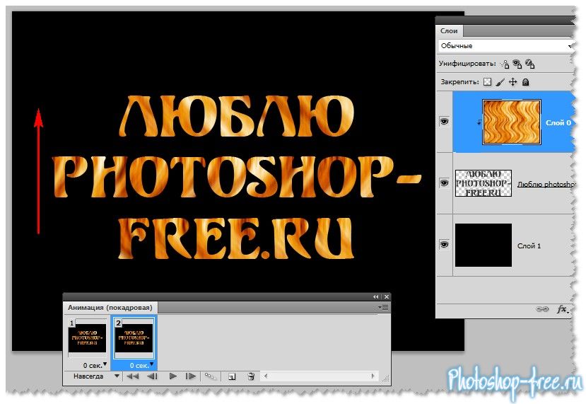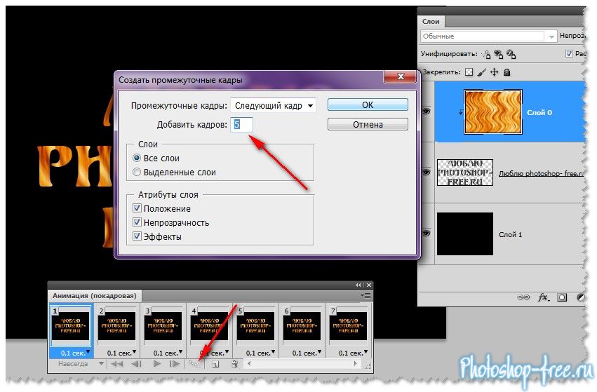 Теперь кликаем на слое с огнем и в меню выбираем Создать обтравочную маску. Теперь создадим фон. Новый слои и заливаем черным цветом. Переносим его в самый низ. Анимация. Идем в меню с верху Окно - Анимация, открылось окно с анимацией . Заставим огонь двигаться. Берем инструмент В окне Анимация у нас уже есть 1 слой. В панели слоев передвинем наш огненный фон вниз, что бы границей не задевал текст. Теперь создадим второй слов панели анимации. Кликните на иконку создания слоя Теперь снова будем работать с нашим огнем. Теперь мы огонь поднимаем выше. В панели Анимация добавим кадры для плавности. Для этого кликаем на 1 слой, чуть ниже картинки выставляем время 0,1 , выбираем иконку Создание промежуточных кадров , в окне ставим 5 кадров нажимаем ок и у нас автоматически добавилось 5 кадров. Чем больше кадров,тем плавнее анимация. Мы можем нажать плей и тогда увидим анимацию. Можете продолжить дальше добавлять кадры . Я так и сделаю. Я проделаю предыдущие шаги и подвину наш фон еще выше и прибавлю еще 5 кадров. Что бы сохранить нажимаем Фаил -Сохранить для web устройств. В появившемся окне нажимаем сохранить.