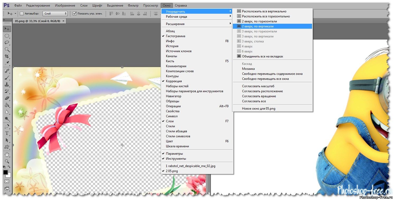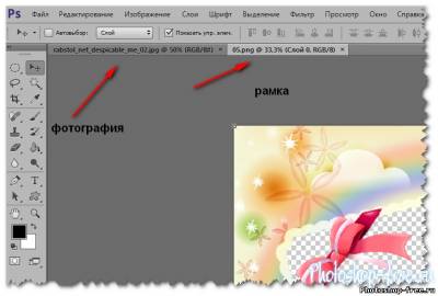 Открываем в фотошопе нашу рамку и фотографию... (выбрать рамку в фотоальбоме или поискать на сайте ) в фотошопе моложе cs 4-5 версии рамка и фото открываются, как отдельный документ.