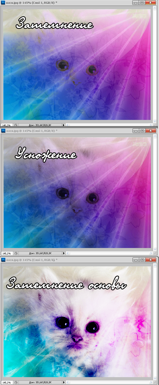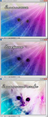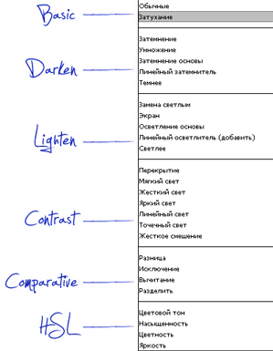 Фильм о режимах наложения на англ. языке Режимы наложения описание на форуме + перевод с англ. на русский. Режимы наложения слоев находятся в выпадающем меню вверху панели Layers. Режимы наложения также можно применять к изображениям посредством выпадающего меню на панели инструментов. Режимы наложения разбиты на 6 различных секций.