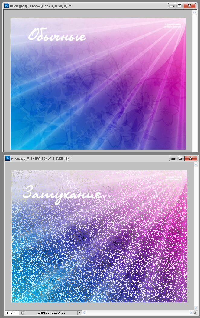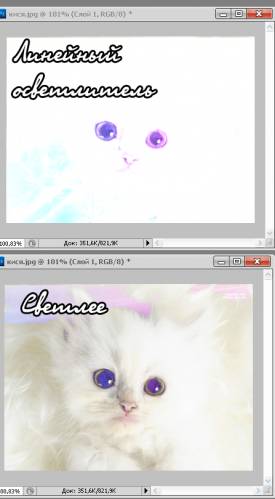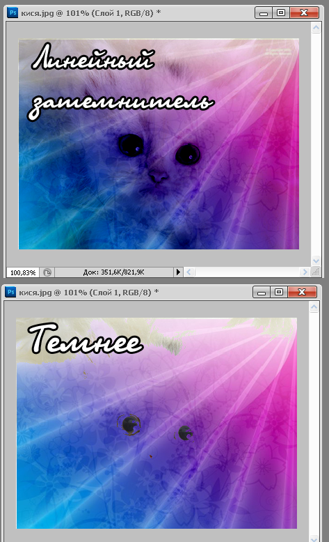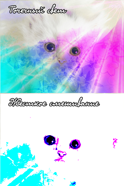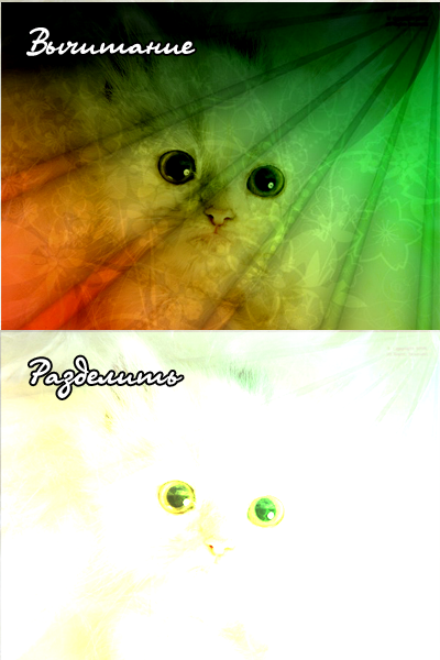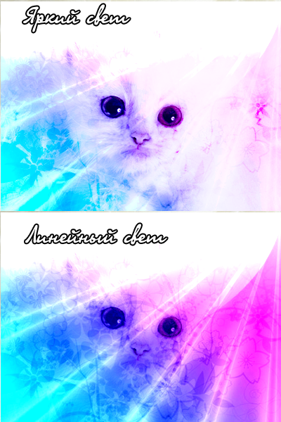 Некоторые режимы наложения нуждаются в придании им полупрозрачности для достижения лучшего эффекта. Со всем многообразием функций Photoshop, только экспериментирование даст реальное понимание техники. Рассмотрим на примере 2х картинок действие режимов наложения. Basic Обычные , нормальные (Normal) - Пиксели верхнего слоя непрозрачны и потому закрывают нижний слой. Изменение прозрачности верхнего слоя сделает его полупрозрачным и заставит смешаться с другим слоем. Darken Затемнение (Darken) - Сочетает цвета верхнего и нижнего слоев и смешивает пиксели в местах, где верхний слой темнее нижнего. Линейный затемнитель (Linear Burn) - Использует тот же подход, что и режим Color Burn, но производит более сильный затемняющий эффект. Если верхний слой белый – изменений не произойдет. Lighten Замена светлым (Lighten) - Сравнивает цвета верхнего и нижнего слоев и смешивает пиксели, если верхний слой светлее нижнего. Contrast Перекрытие (Overlay)- Комбинирует эффект режимов Умножение (Multiply) и Экран (Screen), смешивая верхний слой с нижним. Если верхний слой на 50% серый – эффекта не будет. Яркий свет (Vivid Light)- сочетает эффект режимов Затемнение основы (Color Burn) и Осветление основы (Color Dodge) и применяет смешивание в зависимости от цвета верхнего слоя. Если верхний слой на 50% серый – эффекта не будет. Точечный свет (Pin Light)- Смешивает светлые цвета, используя режим Замена светлым (Lighten), и темные цвета, используя режим Затемнение (Darken). Если верхний слой на 50% серый – эффекта не будет. Comparative Разница (Difference)- Отображает тональную разницу между содержимым двух слоев, удаляя светлые пиксели из какого-либо из слоев. В результате получается темная и иногда перевернутая картинка. Вычитание HSL Hue- Комбинирует Hue (цвета) верхнего слоя и Saturation (колебание цвета) и Luminance (тонов) нижнего. Color- Комбинирует Hue (цвета) и Saturation (колебание цвета) верхнего слоя с Luminance (тонов) нижнего слоя. Сообщить о проблемном уроке | |