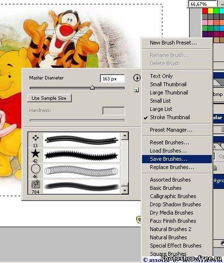 4.Что бы сохранить наш набор идем Brush Tool (B), правая кнопка мыши, выплывающее меню Save Brushes и сохраняем