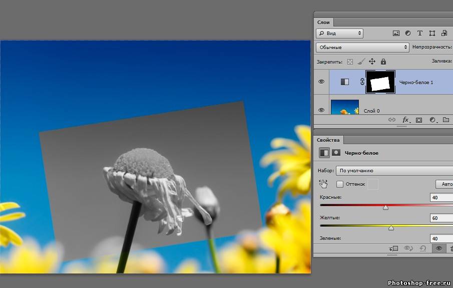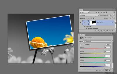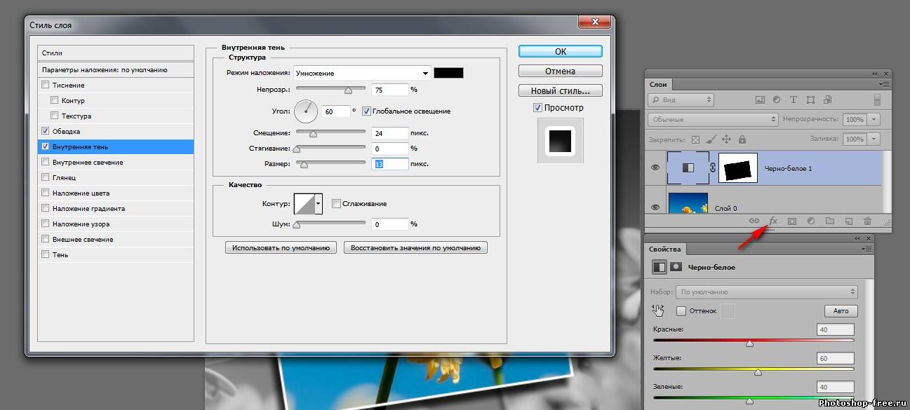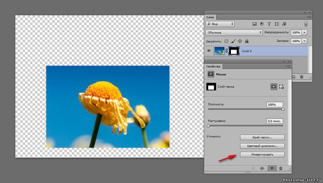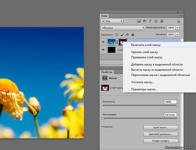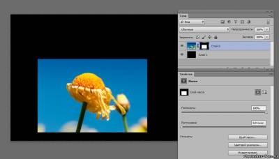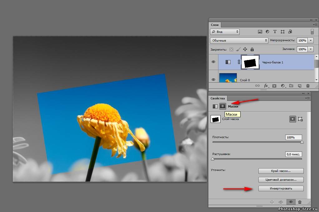 В версиях ниже cs6 доступна панель маски. В cs6 данная панели нету , теперь все настройки маски появляются в панель свойства. Когда маска активна настройки можно изменять. Например можно нажать инвертировать, или уменьшить интенсивность маски. ( 1 рис.) Создадим новый слой . Перенесем его под слой с маской. И зальем черным цветом. Теперь у нас видна только выделенная область и задний черный фон. Теперь попробуем отключить маску. Для этого на слое с маской , на маске кликаем правой кнопкой мыши и выбираем меню " Отключить слой-маску". Маска зачеркивается и мы возвращаемся в исходное положение. Включаем маску обратно. 2 раза жмакаем на маску. Наша маска состоит из 2х цветов - белый и черный. Если мы возьмем кисть и нарисуем все что угодно на черном фоне, то все что было спрятано, снова станет видным. А если зарисуем все черной кистью, то опять спрячется. 3. Корректирующий слои или слой-заливка. Удалим нашу маску. Клик правой клавишей мыши на маске - удалить слой-маску. Берем инструмент Прямоугольная область (Rectangular Marquee Tool) . Выделяем наш цветочек в прямоугольник, идем в меню выделение - трансформировать выделенную область. Поворачиваем выделенную область , что бы рамка была наискосок. 2 раза клик по рисунку что бы убрать рамку трансформирования. В панели слоев кликаем на черно- белый кружочек "слой-заливка" и выберем в меню "черно-белое". В панели свойства выберем инвертировать и цветочек становится цветным. Идем в стили слоя. Внутренняя тень и обводка Если взять Перемещение (Move Tool) и перемещать нашу рамку по изображению , эффект останется в любом положении. так же эффект остается при трансформировании рамки рамки ![]() ![]() ![]() Сообщить о проблемном уроке | |