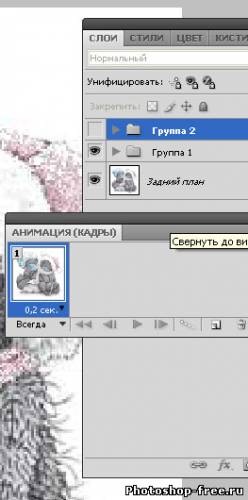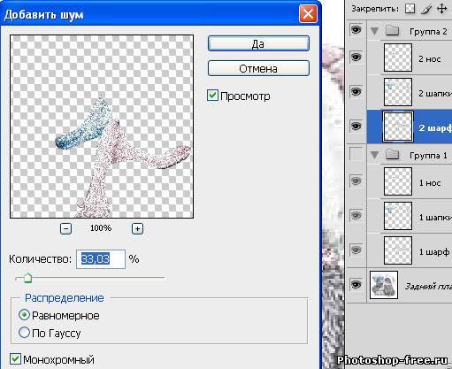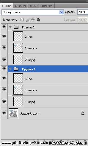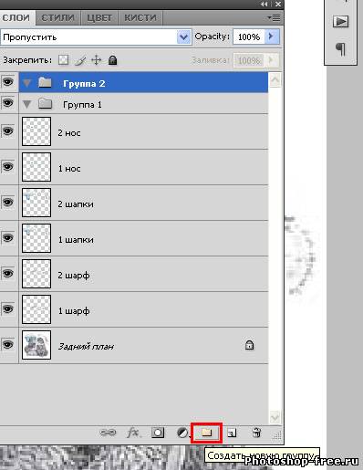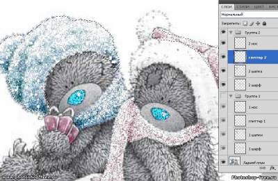 3.Руки Шаг 2. Берем инструмент Лассо и выделяем нос. P.S после выделения первого носика нажимаем и удерживаем shift и выделяем второй носик. ![]() Шаг 3. В панели слоев нажимаем ctrl + j дублируется наше выделение. Назовем его 1 нос ![]() Шаг 4. В панели слоев нажимаем ctrl + j на слое 1 нос. У нас продублирует наш носик. Назовем слой 2 нос. ![]() Шаг 5. Теперь тоже самое проделываем с шапками и шарфом. У меня отдельно слои с шапкой и слои с шарфом. Выделяем ![]() Делаем копию ( дубликат ) от первого слоя. И дублируем наши шапки и шарфы. Сейчас положение слоев у меня вот такое. ![]() Шаг 6. Создаем 2 группы. Перекидываем слои с единичкой а группу 1, с двойкой в группу 2 ![]() ![]() Шаг 7. Убираем глазик с группы 2. Добавляем к нашему шарфу шума. Фильтр - Шум - Добавить шум. ![]() Шаг 8. Убираем глазик с группы 1 и включаем видимость у группы 2. Добавляем шум к 2 слою с шарфом.Фильтр - Шум - Добавить шум. Увеличиваем на немного шума. ![]() Шаг 9. То же самое повторяем со слоем нос 1 и нос 2. ![]() Шаг 10. Теперь работаем только со слоями шапки. Так же добавляем шума на оба слоя, но со значением меньше 20. У меня стоит 14 для первого слоя с шапкой и для второго 19 . CTRL клик на слой с шапкой 1. Выделилась наша шапочка.Создаем новый слой. И заливаем наш новый слой 1 узором . Для слоя со 2 шапкой используем узор 2.![]() ![]() ![]() ![]() Шаг 11. Приступаем к анимации. Открываем панель анимации. Окно - анимация. Ставим время отображения кадров 0,2. Вы можете поставить любое другое время. Ели хотите что бы двигалось быстрее ставим 0,1 ,если медленнее 0,5. В панели слоев делаем невидемую 2 группу. ![]() Шаг 12. В панели анимации создаем новый кадр. И включаем 2 группу. ![]() Шаг 13. Вот и все. Осталось сохранить. Фаил - сохранить как web. ![]() Скачать psd + глиттеры