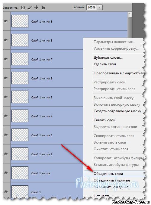 Теперь объединим наши слои в 1. Выделим их в панели слоев и нажмем ctrl+e или в панели меню слой - объединить слои