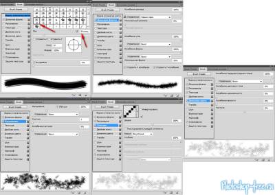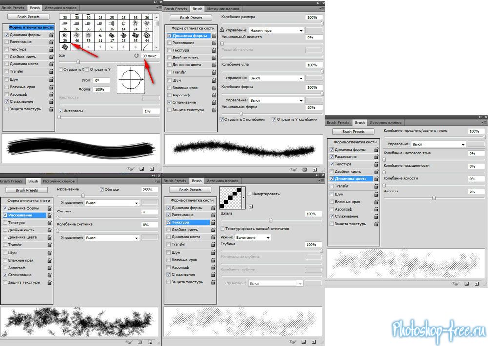 Шаг 5. Наводим красоту яркими пятнами Создаем новый слой и назовем его Цвет. Для ярких пятен мы будем использовать 3 цвета например #e6631b, #00f4fd, #9f1e6b . Берем мягкую кисть и выставляем размер примерно 60 px и начинаем хаотично точечно раскрашивать наш текст разными цветными точками. Режим наложения слоя ставим Перекрытие Overlay. Шаг 6. Придадим фон нашему тексту. Открываем скаченный ранее мини узорчик Создадим новый слои и назовем его Линии. Поставим слой перед слоями с текстом. Ставим цвет переднего пала #e8641b и заднего #ffd200. Выбираем в панели инструментов кисть. далее идем в меню наверху Окно - Кисти (Window > Brush) . - Форма отпечатки кисти Brush Tip Shape выбираем Spatter размер 39 - Динамика формы Shape Dynamics: