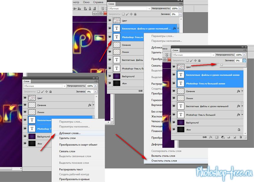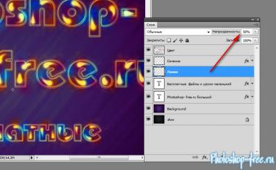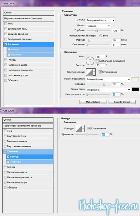 Шаг 8. Делаем фон для текста Кликаем правой клавишей на слой с большим текст и в появившемся меню выбираем Создать рабочий контур Create Work Path. Далее выбираем в панель слоев слой который мы назвали Линии. В панели инструментов выберем инструмент Нажмите Enter что бы убрать пути. То же самое проделайте со вторым текстом. Ставим Непрозрачность слоя Линии на 50% или любое другое на ваше усмотрение. Шаг 9. Глянцевый эффект. Выделяем два слоя с текстом ctrel+клик на 1 слои потом на второй. Затем нажимаем правой кнопкой мыши и в появившемся меню выбираем Дубликат слоев . Перенесем два наших дубликата поверх слоев "Свечение" и "Линии". Далее правой кнопкой мыши на слоях и в меню выберем Очистить стили слоя. Заливку ставим на 0 Дважды кликните на копии слоя с большим текстом и применим такие настройки стиля слоя: – Тиснение Bevel and Emboss