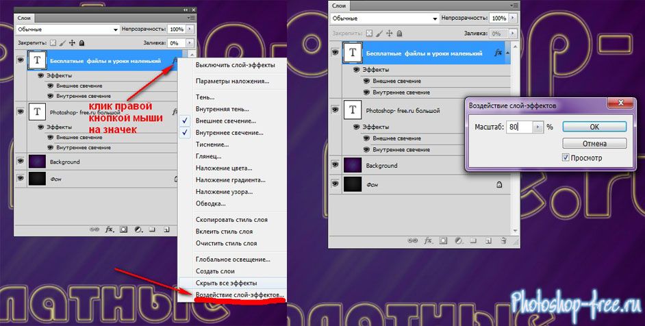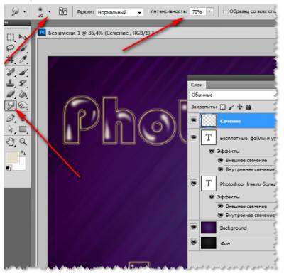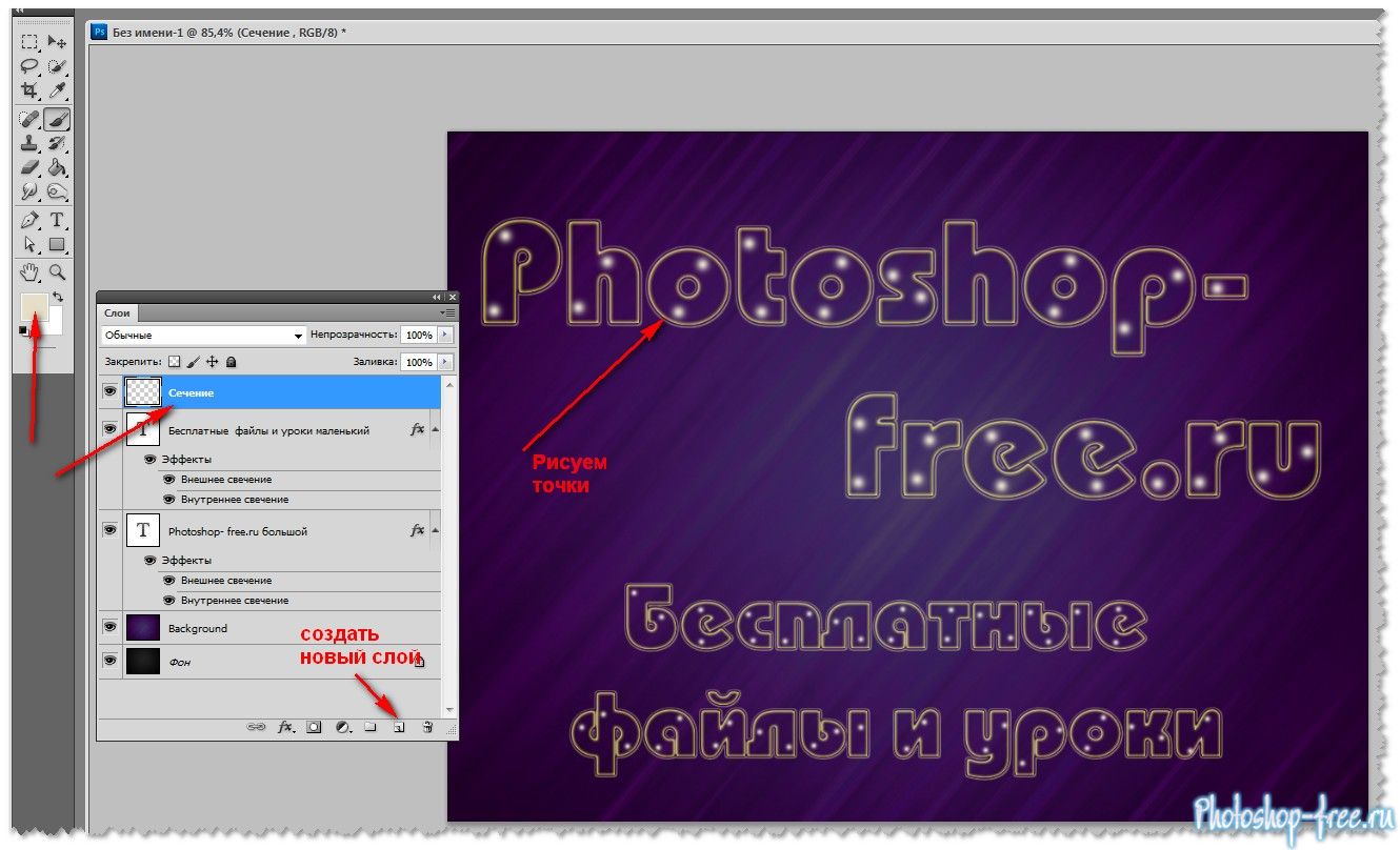 Заливку ставим на 0 Скопируем стиль слоя большого текста и вставим к маленькому. Для этого правой кнопкой мыши в панели слоев кликните на слой с большим текстом и выберите в меню Скопировать стиль слоя. Затем выберите в панели слоев текст с маленькими буквами и клик правой кнопкой мыши по слою выберите в меню Вклеить стиль слоя Уменьшим интенсивность эффекта на слой. Для этого в панели слоев , выберем слой с маленькими буквами и нажмем правой кнопкой мыши по значку FX в меню выберем Воздействие слой-эффектов и ставим Масштаб 80% Шаг 3. Отблески Теперь создадим новый слой. Назовем его например Свечение. Выставляем цвет переднего плана #e5dfc9. Берем мягкую кисть например 20 размера , а для маленького текста 10 ( на ваше усмотрение) . Рисуем точки в буквах, там где в дальнейшем у нас будут блики. Берем инструмент Шаг 4. Наводим красоту бликам Применим к слою Свечение стилей слоя. – Внешнее свечение Outer Glow
