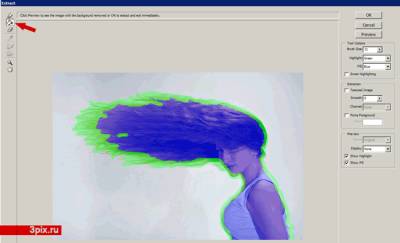 Если вы пробовали в фотошопе вырезать волосы человека на фотографии, несомненно, знаете что это очень трудоемко и долго, а если на голове у человека шикарные кудри, как у Электроника, то над фотографией можно просидеть не один час. При использовании инструментов ластик или лассо вырезанные волосы получаются неестественные, но есть способ очень быстрый и эффективный. Как и большинство инструментов для выделения лучший результат будет, если у вас темные волосы на светлом фоне. Ну что же давайте учиться. Открываем фотографию с шикарной прической (Ctrl+O). Теперь открываем в меню фильтры функцию «Извлечь» (Filter >> Extract или просто Alt+Ctrl+X).