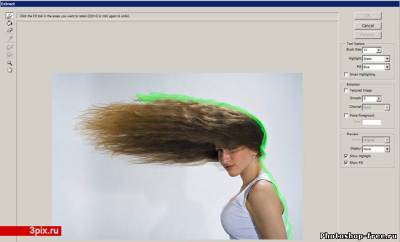 Откроется окно, и инструмент для выделения уже должен быть нажат (или сами можете выбрать, самый первый в панели слева). Начинаем выделять область, где необходимо вырезать волосы. Чем меньше размер кисти, тем более качественнее у вас получиться. Выделение у вас должно в итоге быть замкнутым. После того как вы закончили выделять контур и места с проблемными волосами, берем инструмент Full Tool (G) и заливаем внутри выделенной области и нажимаем ОК. Смотрим, что у нас получилось. Если у вас вырезалось грубовато, попробуйте сначала, только с меньшим диаметром кисти. После нескольких попыток вы начнете чувствовать инструмент. Попробуем поместить девушку на другой фон. Вот что получилось. До и после. Получился почти рекламный постер.) Сообщить о проблемном уроке Источник: http://3pix.ru/hair_selection_photoshop | |