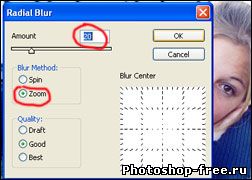 4. Теперь, не снимая выделения примените фильтр Фильтры>Размытие>Радиальное размытие (Filter > Blur > Radial Blur.)