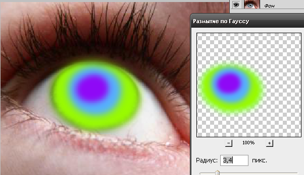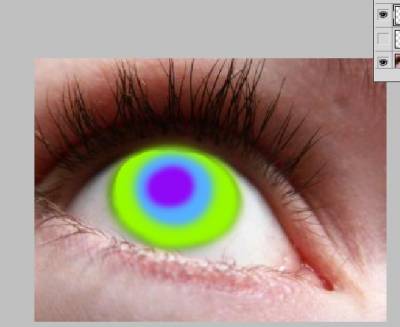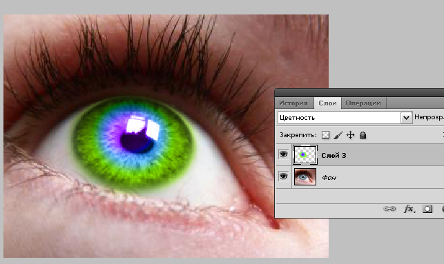 Далее применим к нашему слою режим наложения "цветность". Ну вот и у нас получилось разноцветный глаз)