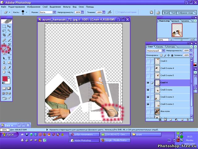 11.аналогично поступаем с другой рукой,которая держит девушку,чтобы аккуратно работать ластиком лучше увеличить масштаб изображения. и так имеем на этом этапе.