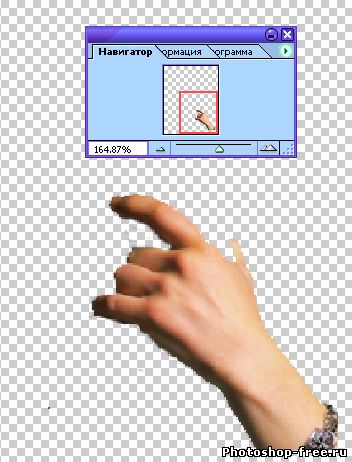 теперь дублируем это выделение на исходном фото и делаем все остальные слои невидимыми чтобы ничто не мешало избавляться от лишнего.теперь аккуратненько убираем со слоя все,кроме руки,если края получились жесткими их можно смягчить,например размытием. имеем на этом этапе: