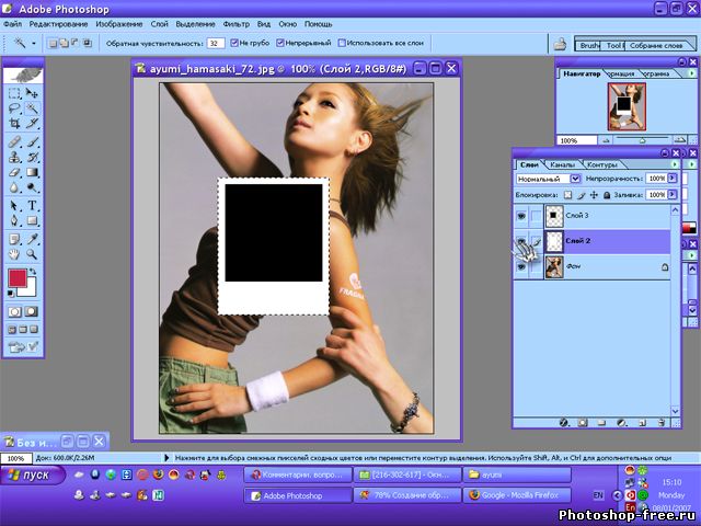 1.и так открываем наш исходник в фотошопе,теперь создадим новый слой. Слой--Новый--Слой||Layer--New--Layer||Ctrl-Shift-N и на нем выбираем примерную область фотограии на полароиде квадратным выделением, чтобы выделение было квадратным выделяйте нежную вам область удерживая клавишу Shift. Закраиваем эту область черным цветом Редактирование -- Залить || Edit--Fill || Shift-F5 2.теперь создадим еще один новый пока пустой слой Слой--Новый--Слой||Layer--New--Layer||Ctrl-Shift-N и расположим его под слоем с черным квадратом создадим такое выделение,чтобы оно было похоже на рамку фотографии палароид и закрасим его как в предыдущем шаге только уже белым цветом. и так имеем три слоя-исходник,черный квадрат и фоторамка.  3.сольем слои,где у нас части кадра,перейдем на слой черного квадрата убедимся,слой белой рамки видим(рядом с ним значок глаза) и соединяем слой квадрата с нижним видимым слоем Слой--Склеить с нижним || Ctrl-E 4.теперь лучше оставить этот слой с кадром палароида и не трогать,чтобы в случае чего не повторять его прорисовку. просто пробудлируем его на новый слой Слой--Дублировать слой || Layer--Dublicate Layer || Ctrl-J 5.теперь еще несколько раз продублируем слой с кадром палароид,в зависисомти от того,сколько фотографий должно потом получиться. 6.у нас есть несколько слоев с фотокадрами палароид,теперь начнем с самого нижнего а видимостть всех остальных уберем (для этого нажмем 1 раз на значек галаза рядом со слоем) 7.теперь сделаем этот слой чуть прозрачнее,чтобы видеть над какой областью картинки будет фото кадр на фото. можно так же поворачивать данное изображение Редактирование--Трансформация--Поворот || Edit--Transform--Rotate  аналогично проделываем данную операцию с каждым следующим фотокадром,продвигаясь от самого нижнего в верхнему(не обязательно в таком порядке,но так удобнее) 8.на этом этапе мы имеем кучу фотографий палароид над нашим изображением,но пока все кадры там черные. 9.снова делаем все слои палароида невидимыми переходим на слой самой нижней фотографии,выделяем волшебной палочкой черную область на этом квадрате
