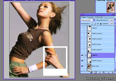 переходим на слой с изображением-исходником,выделение,которое сделали на том слое должно остаться,теперь дублируем эту область. Слой--Дублировать слой || Layer--Dublicate Layer || Ctrl-J  разместим этот новый слой над слоем фото и сливаем его с ним.получили один нормальны фотокадр.  дальше идем так пока не получим искомую стопку  10.теперь встает вопрос о том,как добавить фото немного волшебства например чтобы рука выходила за рамки фото,я начала с руки девушки с краю стопки фото. Выделим часть руки,которая должна выходить за пределы рамки