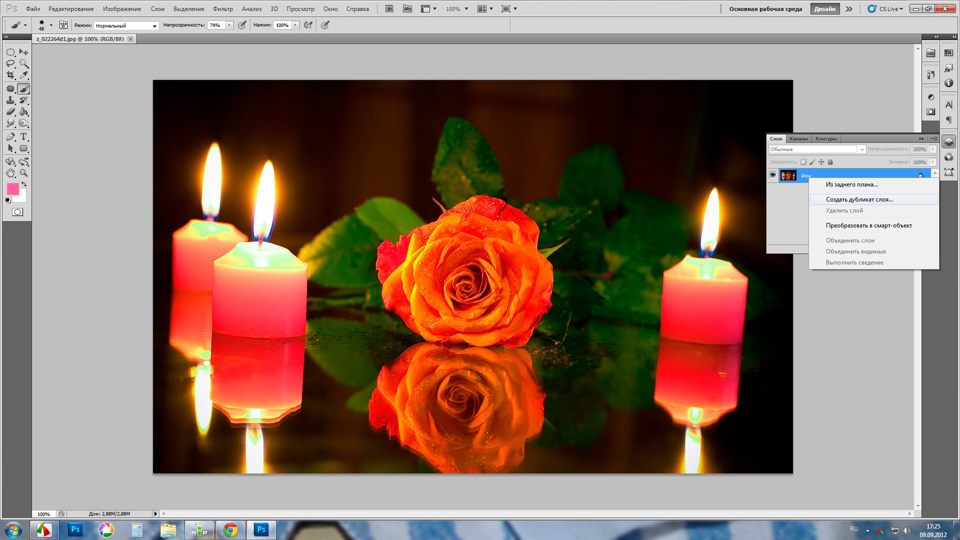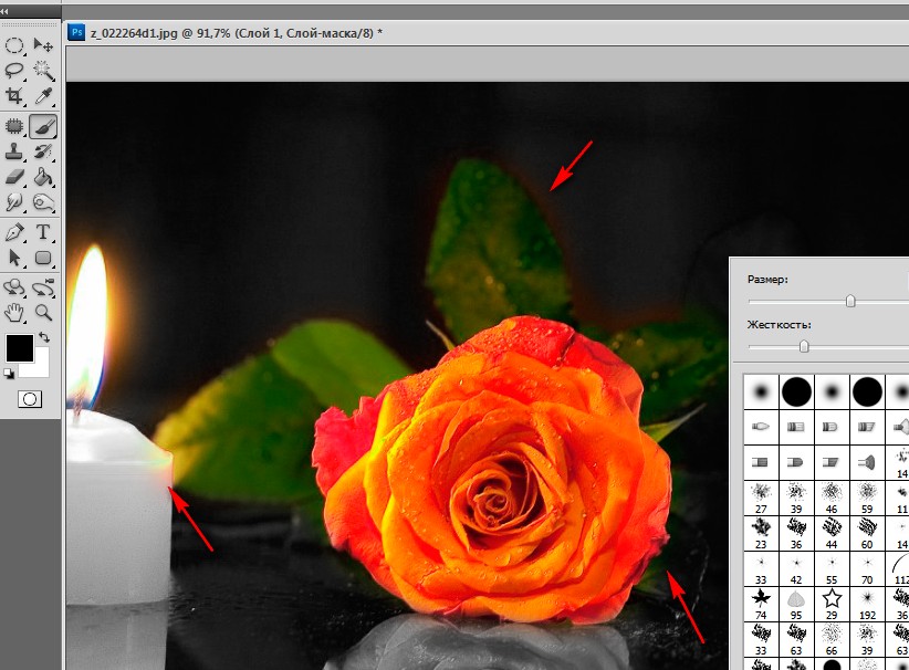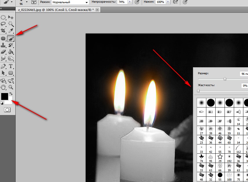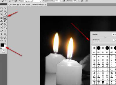 В уроке используется Adobe Photoshop CS5 Шрифт scriptina Оригинал фото Простой урок для фотошопа, с использованием маски слоя. Шаг 1. Открываем в фотошопе нашу картинку или фото Шаг 2. В панель слоев дублируем наш слой CTRL+J или щелкаем на нашем слое левой клавишей мышки, в появившемся окошке выбираем меню СОЗДАТЬ ДУБЛИКАТ СЛОЯ Дубликат делаем черно-белым. Для этого идем в меню изображения>> коррекция >> обесцветить Шаг 3 Теперь создаем слой-маску. В панели слоев нажимаем на прямоугольник с кругом. Шаг 4 Берем инструмент кисть. Я для начала взяла кисть очень мягкую что бы выделить рассеивания огонечков свечи. настройки смотрите на рисунке. Обратите внимания что у вас стоит по цветам в панели инструментов. Что бы все получилось, должно быть сначала черный, потом белый. Таким же образом я выделила цветок и пару листиков. Кисть я сделала более жесткой. Если вы заехали за края намеченной цели, это можно исправить нажав меню Редактирование >> Шаг назад ( ctrl + z) или в панели инструментов поменять местами цвета что бы белый был сверху. Кистью аккуратно убираем лишнее. Наша картинка готова. Я добавила еще текст Фотограф - Амбарцумова Екатерина (Ambartsumova Katy) Сообщить о проблемном уроке | |