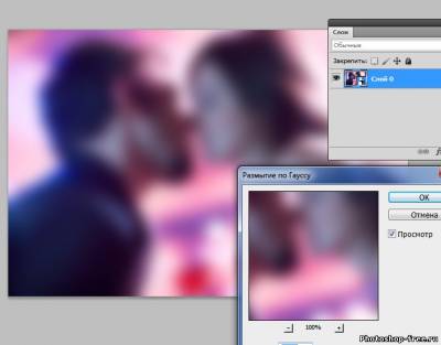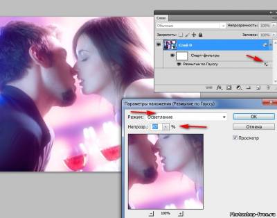 Открываем нашу фотографию Далее кликаем правой клавишей мыши в панель слоев на нашу фотографию, в появившемся окошке выбираем "Преобразовать в смарт-объект" Далее идем в меню Фильтры >> Размытие >> Размытие по Гауссу В появившемся окошке выставляем параметры так, что бы картинки почти не было видно В панель слоев кликаем 2 раза за стрелочки рядом с надписью "Размытие по Гауссу". В появившемся окошке режим смешивания ставим Осветление ( Screen) и уберем непрозрачность на свои вкус. Вот и все наш эффект на фото готов. Сообщить о проблемном уроке | |