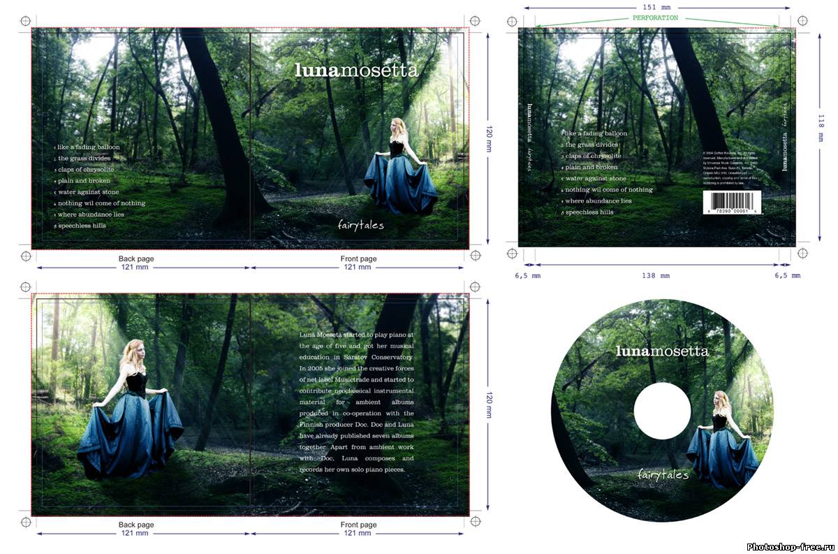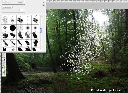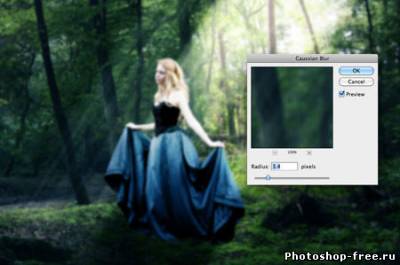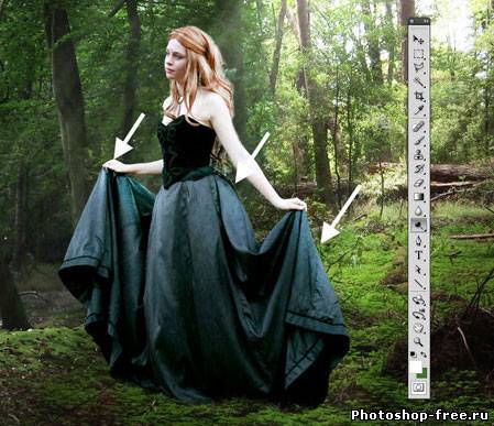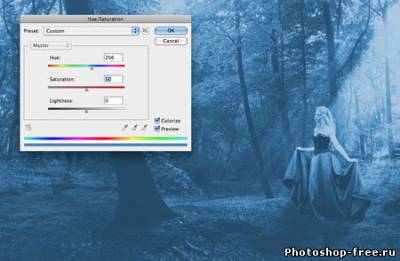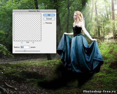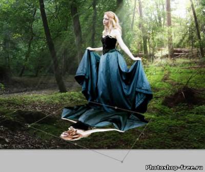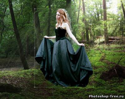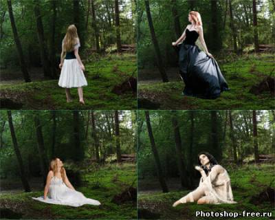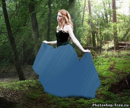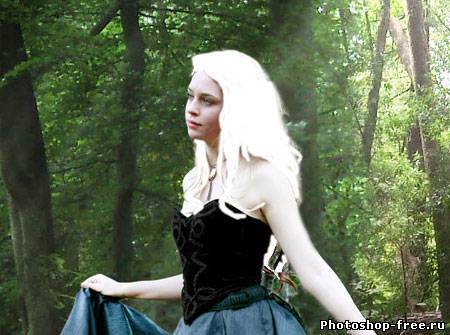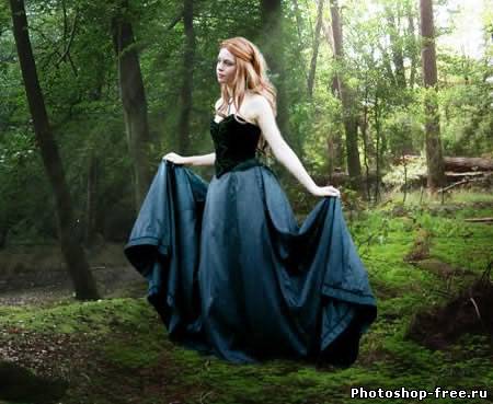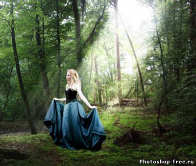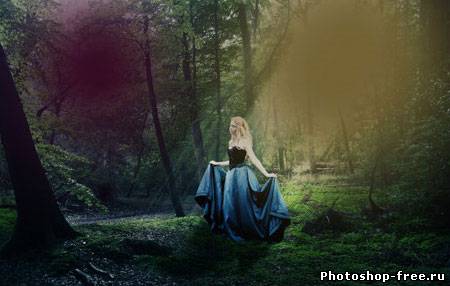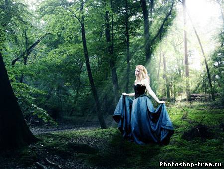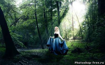 Я начал с поиска подходящего фото для фона. Лесной фон является основой для этой работы, поэтому мне пришлось обыскать не один сток-сайт в поисках идеального фото. Это должен быть довольно мрачноватый лес с большим количеством растительности. Наличие хорошего источника света пришлось очень кстати. В итоге я нашел два потрясающих изображения на сайте DeviantArt, одно от Spiteful-Pie-Stock , а второе - YsaeddaStoc . Первое изображение я загрузил в Фотошоп, дублировал (CTRL+J) и отразил копию по горизонтали с помощью Edit - Transform - Flip Horizontal (Редактирование - Трансформация - Отразить по горизонтали). Чтобы оба изображения влезли, мне необходимо было расширить рабочую область Image - Canvas Size (Изображение - Размер полотна). После этого я слил два слоя вместе (CTRL+E). Чтобы замаскировать стык между двумя фото, я воспользовался вторым изображением. Загрузил его в Фотошоп и разместил в центре. Добавив слой-маску, я аккуратно удалил лишнее. Дерево на втором изображением помогло мне замаскировать проблемное место. Просвет между деревьями в правой стороне был выбран как основной источник света. Здесь я добавил солнечные лучи, чтобы сосредоточить внимание на модели, которую я позже размещу в этом месте. Я использовал стандартную кисть из Фотошопа. Затем я применил фильтр Filter - Blur - Motion Blur (Фильтр - Размытие - Размытие в движении), чтобы создать лучи света проходящими сквозь кроны деревьев. Я несколько раз дублировал слой с солнечными лучами и для некоторых изменил blending mode (режим наложения) на Overlay (Перекрытие) и Soft Light (Мягкий свет), чтобы осветить окружающую растительность. Далее я выбрал модель, которая будет основной частью всей работы. Еще на начальных этапах я уже имел представление, какой должна быть девушка. Я определил несколько подходящих моделей и каждую добавил на лесную поляну, чтобы окончательно определиться с выбором. Я решил воспользоваться фото девушки в черном платье. Это изображение я также нашел на DevianArt'е. Я импортировал его в Фотошоп и переместил на рабочий документ. С помощью Free Transform (Свободное трансформирование) (CTRL+T) я подкорректировал размер и положение Я расположил модель над созданными ранее лучами солнца. Затем подкорректировал цвет с помощью Image - Adjustments - Color Balance (Изображение - Коррекция - Цветовой баланс). Чтобы модель более гармонично смотрелась с фоном, я использовал инструменты Dodge Tool (Осветлитель) и Burn Tool (Затемнитель) (O) на осветленных и затененных участках платья.Далее я изменил цвет платья, чтобы оно было больше похоже на платье Алисы из фильма. Создал новый слой и закрасил необходимую область синим цветом. Затем изменил blending mode (режим наложения) на Color и уменьшил opacity (непрозрачность) до 50%. Далее я проделал то же с волосами, изменив цвет на белый. Blending mode (режим наложения) изменил на Soft Light(Мягкий свет). Волосы стали светлее. Я создал еще несколько слоев с лучами и расположим их над слоем с девушкой. Тень добавит больше реализма. Чтобы ее создать, я дублировал слой с моделью и трансформировал его (CTRL+T). Я закрасил дубликат черным и применил фильтр Filter - Blur - Gaussian Blur (Фильтр - Размытие - Размытие по Гауссу). Затем уменьшил opacity (непрозрачность) слоя до 60%. Чтобы придать соответствующую атмосферу, я добавил корректирующий слой Layer - New Adjustment Layer - Hue/Saturation (Слой - Новый корректирующий слой - Цветовой тон/Насыщенность). Затем я изменил blending mode (режим наложения) корректирую
