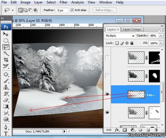 17) Измените режим смешивания слоя на Multiply и уменьшите opacity до 60%.