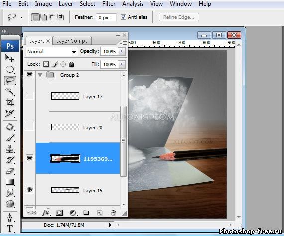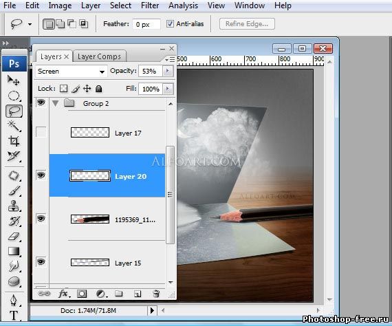 65) Вырежьте тень и разместите ее на новом слое под карандашом. Измените режим смешивания на Multiply.