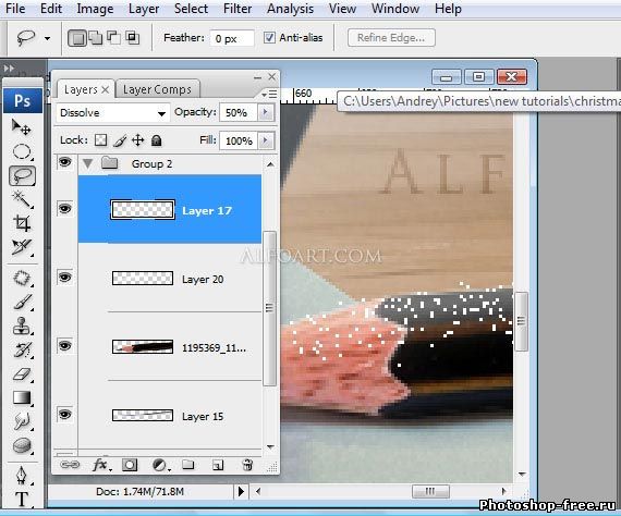 67) Продублируйте слой, измените режим смешивания копии на Dissolve, уменьшите opacity до 50%.