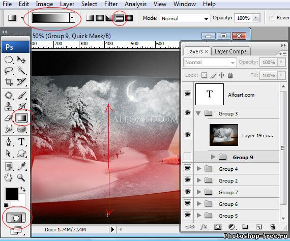 74) Добавьте маску, залейте ее радиальным черно-белым градиентом.