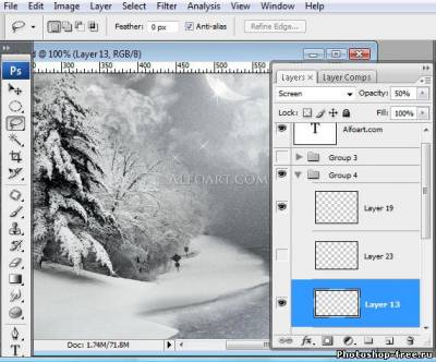 49) Выделите центральную часть пейзажа (feather 40%), скопируйте выделенную область.