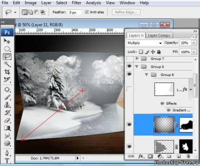 8) Продублируйте нижнюю часть открытки, залейте ее более темным линейным градиентом. Отрежьте левый и правый углы, примените фильтр Gaussian Blur.