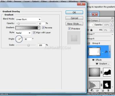 56) Создайте новый слой, залейте его черно-прозрачным радиальным градиентом. Измените режим смешивания на Multiply, уменьшите opacity до 20%.