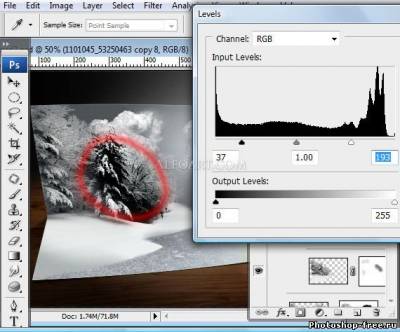 30) Добавьте маску к слою с деревом. Залейте ее черно-белым градиентом, как на картинке ниже.