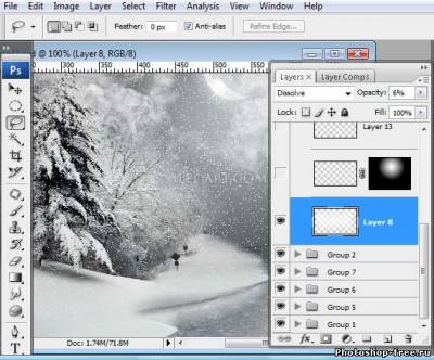 69) На новом слое нарисуйте большой белое пятно, измените режим смешивания на Dissolve, уменьшите opacity до 6%.