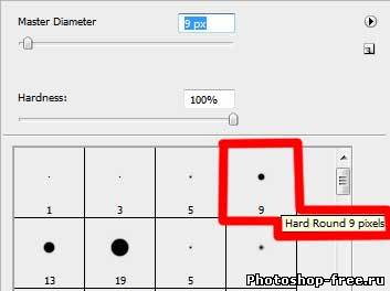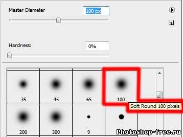 ) черного цвета, диаметр 100, выставляем непрозрачность кисти 10% (Opacity 10%) и затемняем края нашей картинки