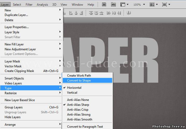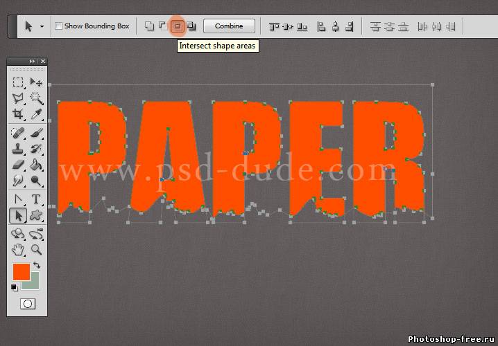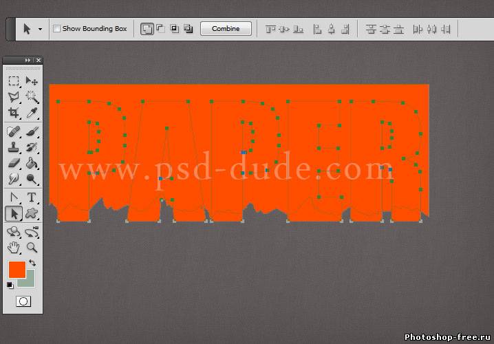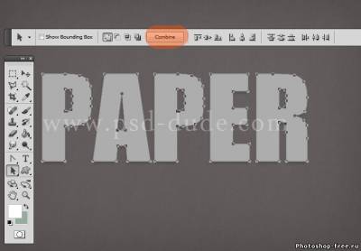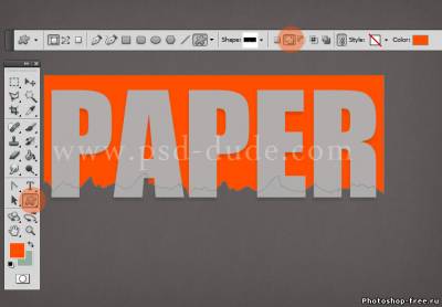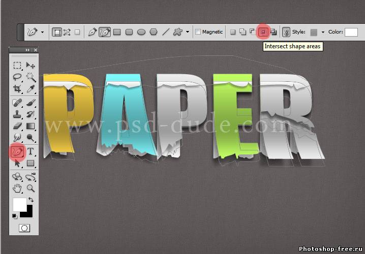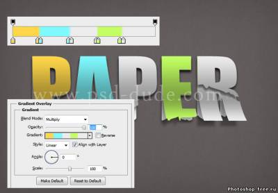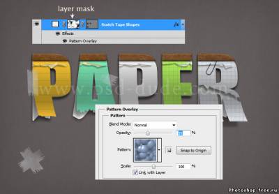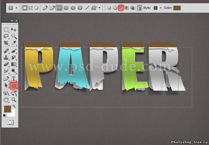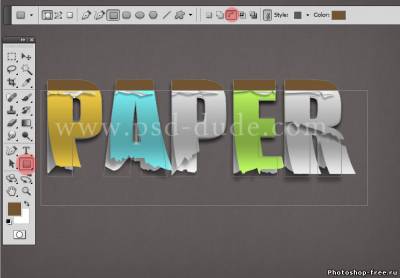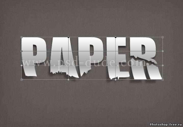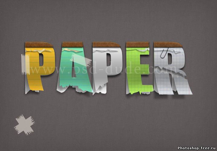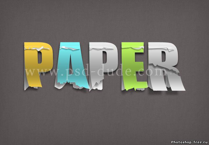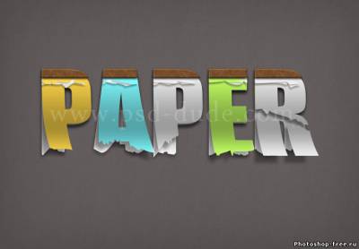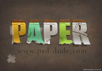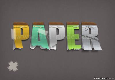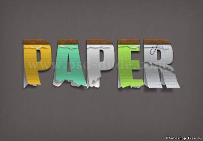 В этом уроке мы будем создавать эффект бумаге текста в Photoshop с использованием рваной формы бумаги и бумажных текстур. Шаг 1 Создайте новый документ (Ctrl + N) и инструментом Горизонтальный текст (Horizontal Type Tool) напишите слово «PAPER». Используйте шрифт «Impact» цветом #d0d0d0. Размер шрифта зависит от размера холста. Назовите текстовый слой «Text Paper 1» и создайте его копию «Text Layer 2». Кликните дважды на первом текстовом слое, чтобы открыть окно стилей. Примените стиль Отбрасывание тени: Режим – Умножение. Шаг 2 Скройте первый текстовый слой и выберите его копию. Кликните правой кнопкой мыши на ней и выберите пункт Преобразовать в кривые (Convert to Shape), либо воспользуйтесь главным меню программы. Выберите инструмент Выделение контура (Path Selection Tool) и выберите все буквы. Затем нажмите на кнопку Объединить (Combine). Шаг 3 Чтобы создать порванные края внизу, загрузите эти фигуры. Создайте новый слой (Create New Layer) и вставьте на него несколько порванных фигур. Используйте режим Добавить к области фигуры (Add to shape area), чтобы все они были на одном слое. Порванные фигуры должны покрыть всю надпись за исключением нижней части. Инструментом Выделение контура (Path Selection Tool) выделите текст и нажмите Ctrl + C. Вернитесь на слой с порванными фигурами и нажмите Ctrl + V). В настройках инструмента выберите режим Область пересечения фигур (Intersect Shape Areas). После этого нажмите на кнопку Объединить (Combine). Шаг 4 Назовите новый слой с текстом «Text Paper Shape 1» и удалите старый – «Text Paper 2». К слою «Text Paper Shape 1» примените стиль Наложение градиента (Layer Style – Gradient Overlay): Режим – Нормальный, Стиль – Линейный. Затем – стиль Отбрасывание тени: Режим – Умножение. Шаг 5 Таким же способом создайте ещё одну порванную надпись. Создайте её копию (Ctrl + J) и назовите её «Text Paper Shape 2», а оригинал – «Shadow». К оригиналу примените стиль Наложение градиента: Растрируйте слой «Shadow» и примените к нему стиль Размытие по Гауссу (Gaussian Blur Filter). К слою «Text Paper Shape 2» примените стиль Наложение градиента с такими же настройками, как у слоя «Text Paper Shape 1». В режиме Деформации (Transform – Warp) измените форму надписи. Шаг 6 Создайте копию слоя «Text Paper Shape 2» и измените градиент, как показано ниже. Мы делаем это для того, чтобы изменить цвет букв. Вы можете использовать любые цвета на своё усмотрение. Шаг 7 Создайте две копии слоя «Text Paper Shape 2» и инструментом Свободное перо (Freeform Pen Tool) в режиме Установите режим Область пересечения фигур (Intersect Shape Areas) нарисуйте фигуры поверх надписи, как показано ниже. Вам нужно создать порванные края. Шаг 8 Сейчас создадим корешок в верхней части букв, как у блокнота. Создайте копию букв и выберите инструмент Прямоугольник (Rectangle Tool), в настройках установите режим Вычесть из области фигуры (Subtract from shape area) и создайте прямоугольник, как показано ниже. Должна остаться только верхняя часть букв. Измените цвет этого слоя на коричневый. К коричневому корешку примените стили, показанные ниже. В качестве текстуры можете использовать одно из изображений Отбрасывание тени: Режим – Умножение. Тиснение: Стиль – Внутренний скос, Метод – Плавное, Режим подсветки – Осветление, Режим тени – Умножение. Наложение цвета: Режим – Линейный свет. Наложение узора: Результат: Шаг 9 На бумажную часть можно наложить сетку и линии. Добавьте скотч на некоторые буквы. Лучше использовать векторные фигуры, вместо, например, кистей ленты скотча. Цвет скотча - #f5efe4,