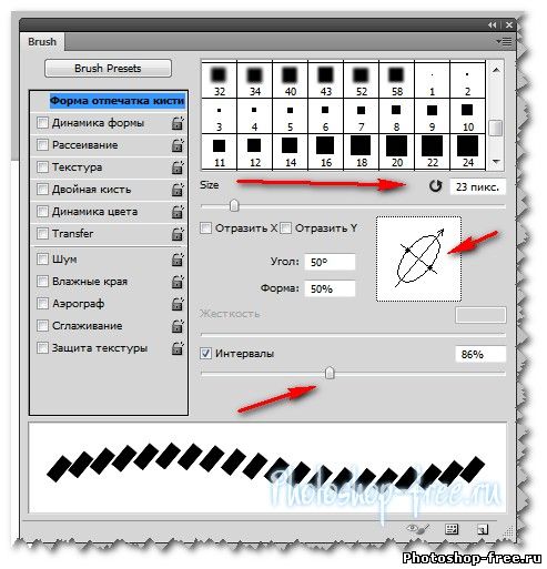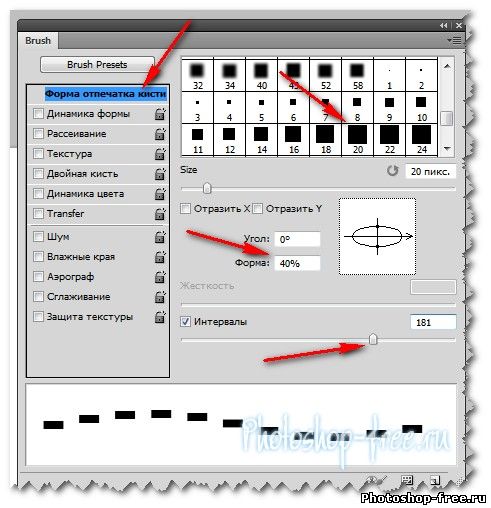 Скачать квадратные кисти Приступаем к созданию пунктирных линий в фотошопе. В панели инструментов выберем инструмент Открываем панель кистей Окно >> Кисти (F5) Далее нам нужно снять галочки со всех пунктов меню. Выбрать меню "Форма отпечатков кисти" и дальше выбрать нашу квадратную кисть и выставлять настройки например: Размер - 20% Форма 40% Интервалы 181 % Если изменять настройки по разному , то и добиться можно совершенно различных результатов. Например измените Угол 90* и линии вертикальные пунктирные линиии тд