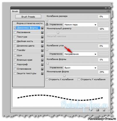 После того, как Вы создали свои пунктирные линии , вы их можете применять с инструментами связанными с кистью. Такие , как Вы можете сделать прямоугольные тире, которые следуют по пути - включить динамики формы в свойствах кисти, и установите регулятор угла к направлению Возьмем инструмент