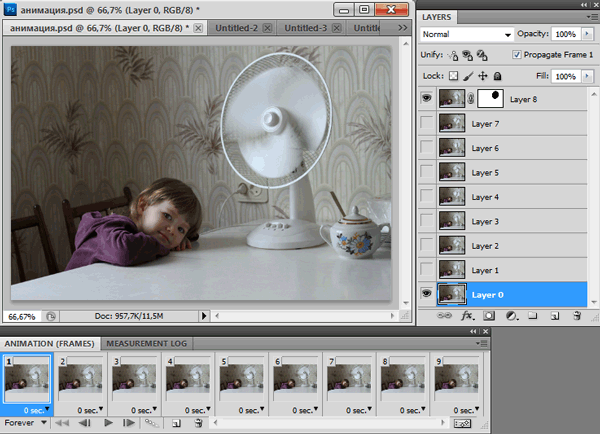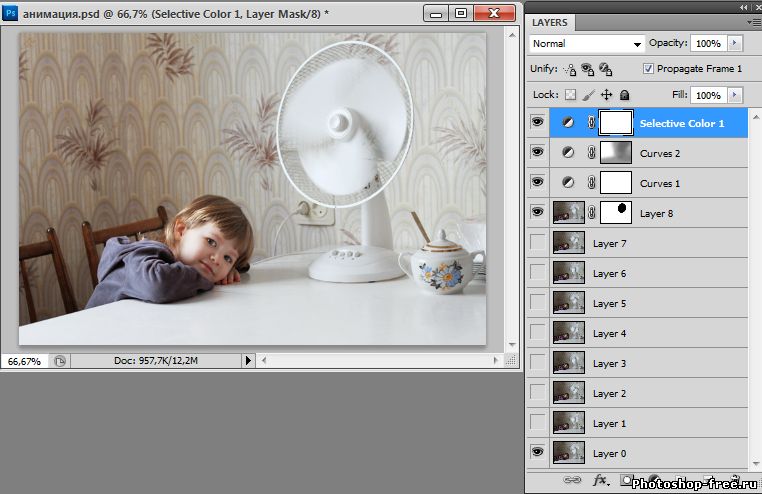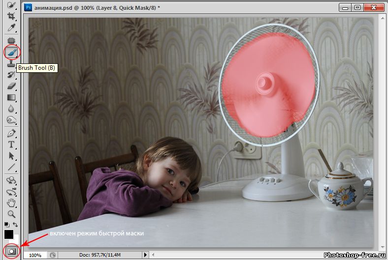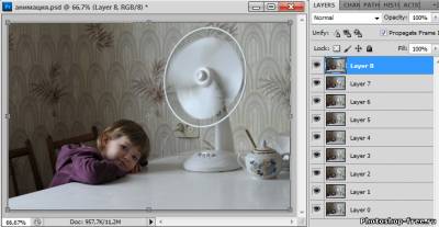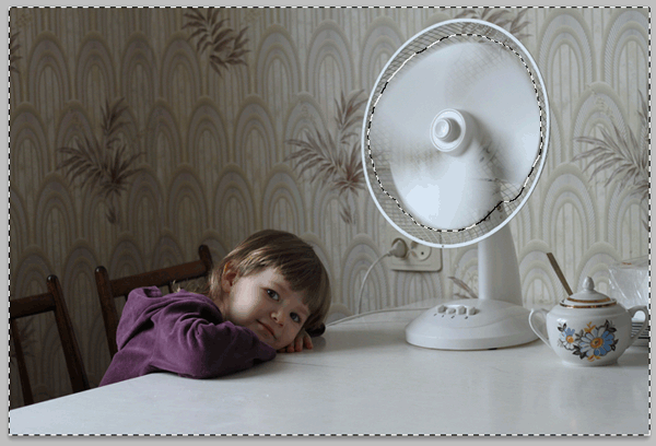 Этап 1. Фотографируем. Для первых экспериментов предлагаю выбирать неодушевленный объект, совершающий простое повторяющееся движение. И лучше, для первого раза, один. Ну вот, например, вентилятор. Стоит на месте, никуда не убежит, крутится циклично - отличная модель. Я ставлю свой вентилятор на кухонный стол, где достаточно света для съемки, расставляю там еще несколько предметов, создавая натюрморт. Сажаю ребенка, чтобы получилось живописнее. Убираю все лишние предметы, стараясь свести к минимуму последующую обработку в фотошопе. Дальше разбираемся с настройками вашего фотоаппарата. Вам необходимо найти режим скоростной съемки, чтобы быстро и без проблем отснять движение лопастей вентилятора. Этот режим означает, что, зажав кнопку съемки, вы сделаете не один кадр, а сразу много - фотоаппарат будет снимать, пока вы не отпустите кнопку (или пока не закончится флешка Wink) Скорость съемки напрямую зависит от того, какая именно у вас камера. Ну а дальше все просто - ставите свой фотоаппарат на штатив (или на ровную устойчивую поверхность), чтобы все кадры были сняты с одинаковой точки, и наша анимация не прыгала. Это очень важный момент! Если камера будет сдвигаться хоть на мм во время серийной съемки - все пропало Smile Включаем вентилятор, а потом делаем серию снимков. Сколько именно снимков - вы легко выясните, приступив к практике. Конечно, чем дольше длится движение вашего объекта - тем больше кадров вам нужно сделать. Вентилятор делает поворот вокруг своей оси довольно быстро, поэтому мне хватило 30 кадров (и то - при обработке мы часть дублей удалим, чтобы уменьшить вес нашей анимации). Этап 2. Работаем с получившимся материалом. Я работаю в фотошопе версии Cs2 и Cs5 (оба - на английском языке), урок буду писать, пользуясь 5 версией. В принципе в новой версии не появилось ничего уникального, связанного с анимацией, но некоторые команды изменили свое расположение. Поэтому спрашивайте, если что Smile 1. Посмотрите все кадры, которые вы отсняли. Найдите начало и конец движения, в нашем случае - когда вентилятор сделал полный круг. Все кадры после этого можно удалить. 2. Если ваш объект совершает небольшое движение, а дублей вышло слишком много - удалите лишние кадры через один. Как правило, после двух этих действий у вас останется немного кадров - 10-30. 3. Откройте все снимки в фотошопе. Перетащите все снимки в один файл - один слой над другим, в том порядке, в котором вы их снимали. Нижним слоем получится начало движения, наверху - конец. 4. Теперь создаем ту самую дырку - маску - через которую будет видно движение только в необходимой области. В нашем случае эту дырку нужно сделать на месте, где лопасти вентилятора. Пусть слой, оказавшийся выше всех станет фоном, в котором мы и будем делать дырку. Выделите его, щелкнув по нему мышкой. Теперь перейдите в режим быстрой маски - кнопка для перехода в этот режим находится внизу панели инструментов После этого возьмите инструмент "Brush tool" (кисть) и закрасьте с его помощью ту область, где нужно сделать дырку. Лучше пользоваться кистью с жесткими краями, чтобы видеть четкие границы области, которую вы выделяете После того, как вы закончили с закрашиваем области, снова нажмите на кнопку режима быстрой маски, выключив его. Вы увидите выделенную область: Теперь превратим выделенную область в векторную маску. Для этого щелкнем 